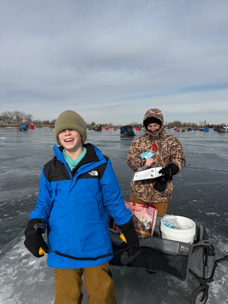 Then came this weekend: ice, community, and the 3rd annual Casey Kulm Ice Fishing Derby. It was a beautiful day out on Dahme Lake — bright, crisp, and full of energy. Blake, Mel, Bodhi, and Scott caught a few fish (nothing that made the leaderboard), but Bodhi still had a great day and even won some prizes, including a sweet Mall of America ticket package to take home.